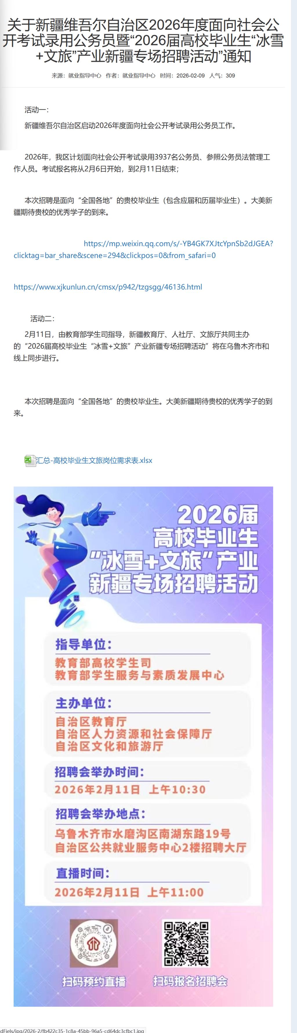https://jy.zime.edu.cn/a/202629/1814.shtml 关于新疆维吾尔自治区2026年度面向社会公开考试录用公务员暨“2026届高校毕业生“冰雪+文旅”产业新疆专场招聘活动”通知