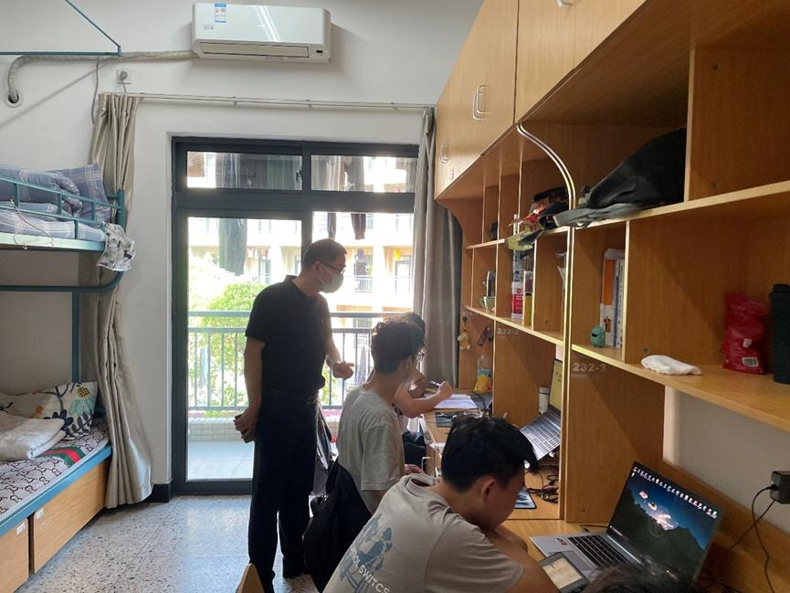 为全面贯彻学校疫情防控工作会议精神,确保学院疫情防控工作真正从严从紧落细、形成严密闭环,为师生撑起防疫“保护伞”,4月11日上午,现代信息技术学院党总支书记任峰深入海宁校区学生寝室,检查防疫工作落实情况,调研学生在寝学习、在校生活状况,关心看望全体大一年级学生。辅导员杨秀飞、李晖陪同。