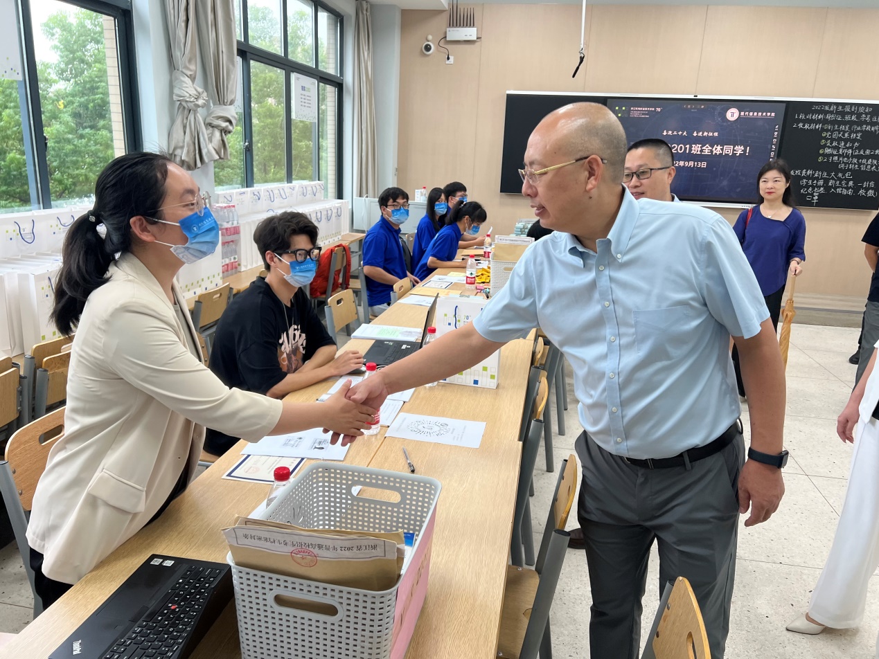 结合学校党委对疫情防控的指示精神以及学工部对开学报到工作的统筹安排,13日上午,学校党委书记汤兆武一行就来到现代信息技术学院报到点检查指导报到工作。汤书记亲切走进每一间报到教室,详细询问报到现场辅导员、班主任,助理班主任及志愿者工作职责,鼓励大家细致服务;与现场新生亲切交流,欢迎新同学的到来。学院院长卢涤非、党总支书记张荣路,党总支副书记朱爱民带领辅导员、新生班主任老师,助理班主任、志愿者们也提前到岗,落实开学报到的具体工作。