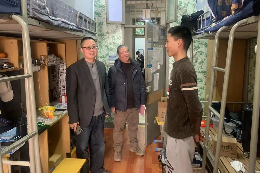 学生到校后,学院党总支书记张荣路,副书记朱爱民带队学工线辅导员、班主任,第一时间深入学生寝室看望到校学生。张荣路书记详细了解学生返校情况,就工作开展力度进行检查与指导。同学们见到亲切的领导老师们,开怀畅谈,张书记叮嘱同学们尽快调整好作息和生活状态,重视寝室卫生和用电安全,严防电信诈骗,守好“压岁钱”,以积极向上的面貌来迎接新学期。