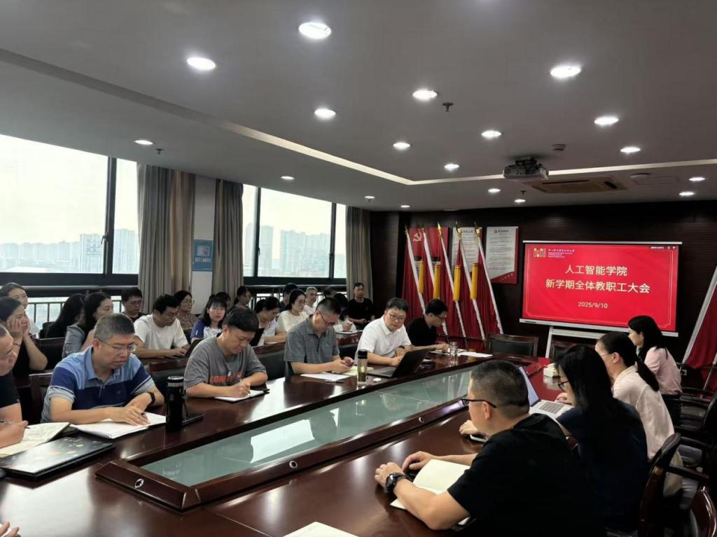为明确新阶段发展方向,凝聚全院奋进力量,9月10日下午,人工智能学院召开新学期全体教职工大会。会议由院长卢成浪主持,学院领导班子和全体教职工参加会议。