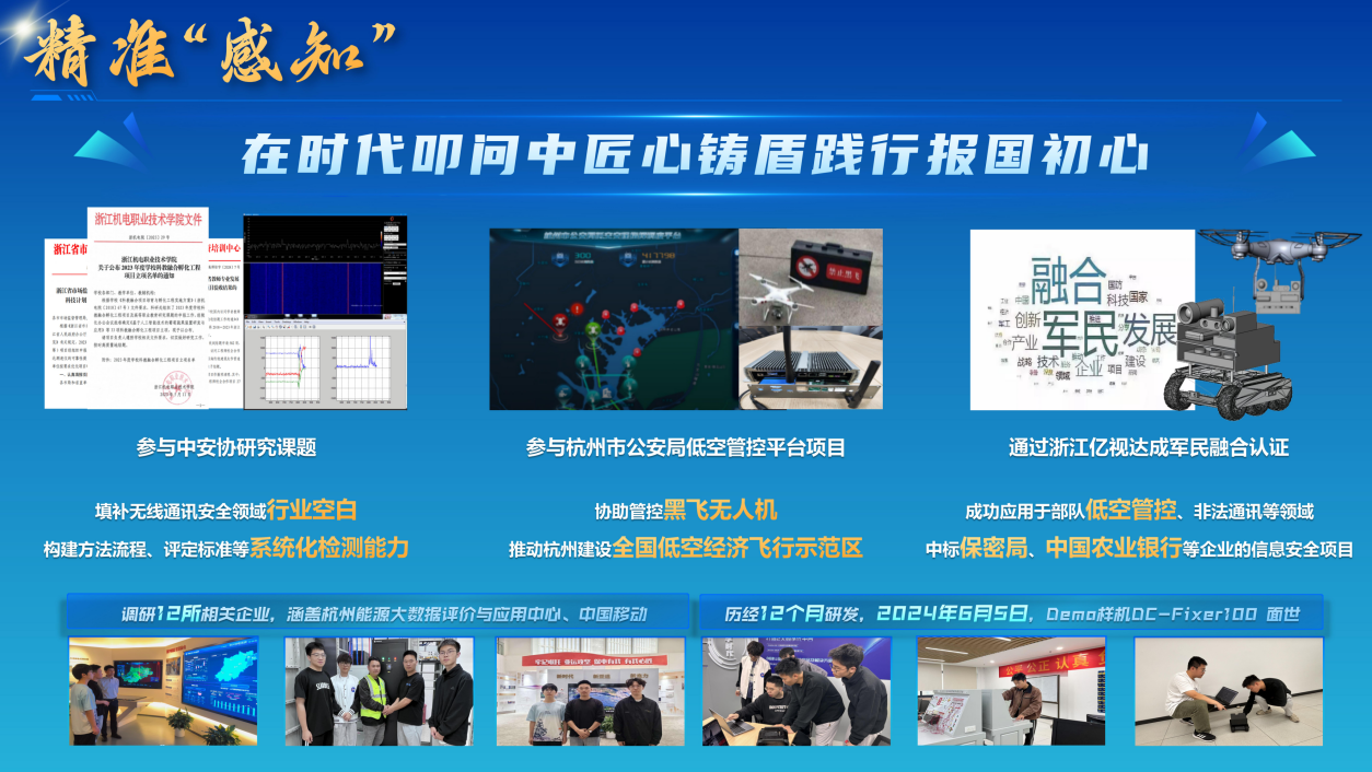 带着这份思考,退伍后他毫不犹豫选择了物联网应用技术专业。大一期间,参与中安协课题,首次接触无线通信安全领域。在老师指导下,团队成功研制出AI驱动的无线检测模块。当它应用于杭州杰能科世低空管控项目、并通过浙江亿视达成军民融合认证时,他更加明白:军营里感知的“家国责任”,已成为“技能报国”的初心底色——他要用技术守护当下安全。