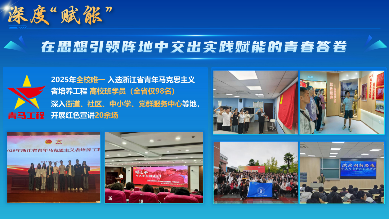 在思想引领阵地,他作为全校唯一入选浙江省“青马工程”高校班的学员,深入基层开展红色宣讲20余场,将党的创新理论转化为“青年话”,推动思想引领与服务实践深度融合。作为学生会主席,他牵头组织“我为同学做实事”、线上权益平台建设等10余项活动,服务师生超2000人次。